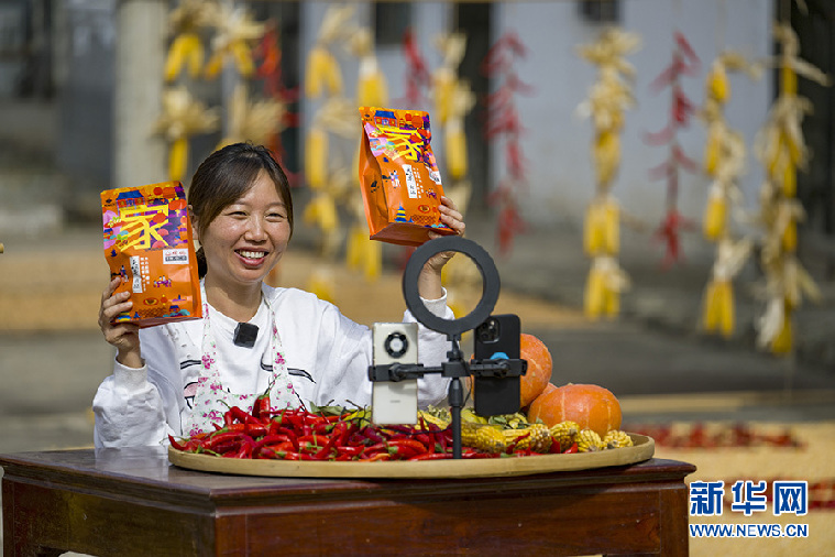 9月29日,安徽省宣城宁国市南极乡龙川村村民通过网上直播销售山核桃等特产。