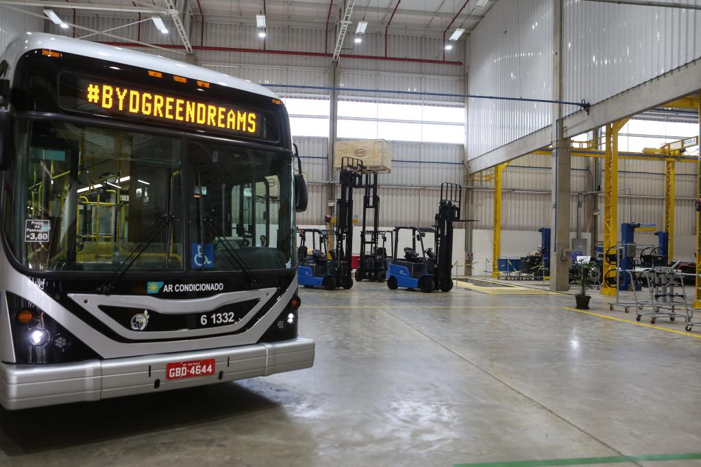 这是2017年4月6日在巴西坎皮纳斯市的比亚迪工厂拍摄的电动大巴车。(新华社发)