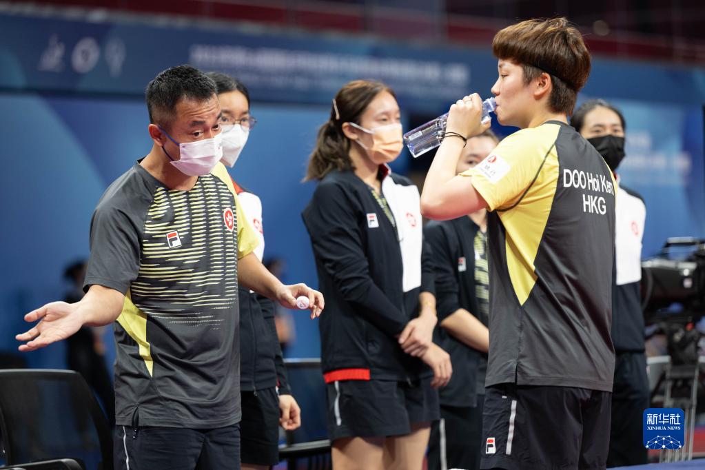 9月30日,中国香港队选手杜凯琹(前右)在比赛间隙接受教练指导。新华社记者 胥冰洁 摄