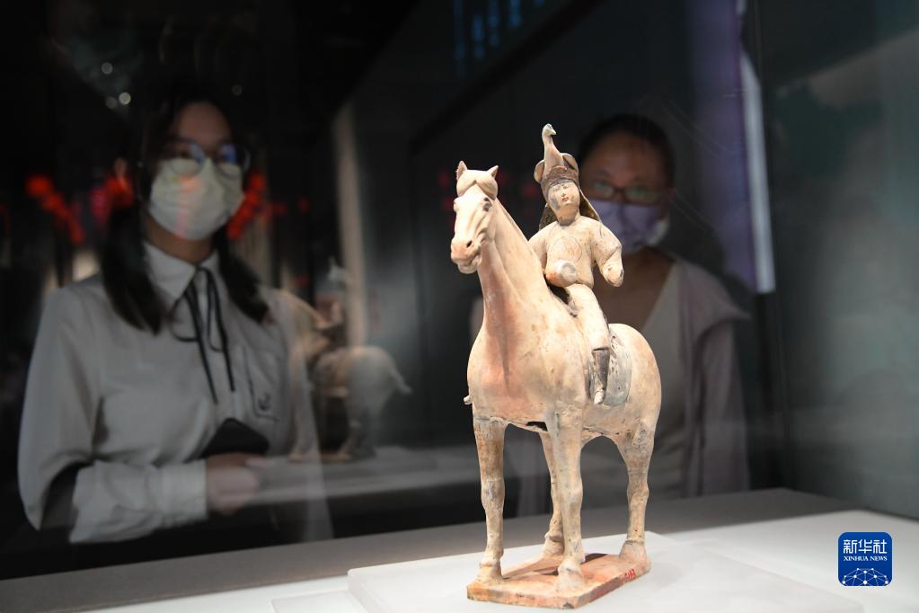 9月30日,观众在西安博物院观看大唐金乡县主展上展出的骑马击腰鼓女俑。
