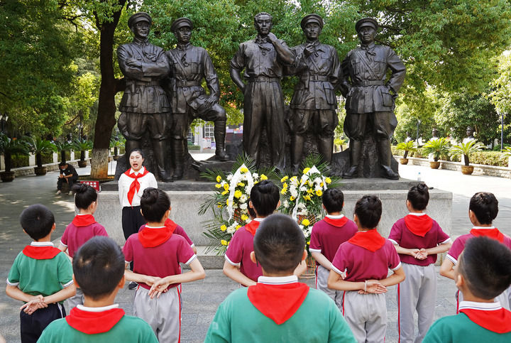 ↑9月29日,在南昌八一起义纪念馆,老师带领濠上街小学的学生朗诵《可爱的中国》。 新华社记者 万象 摄