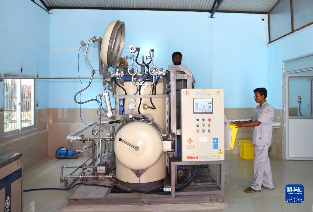 9月29日,在尼泊尔南部比尔甘杰市,纳拉亚尼医院的工作人员操作中国援助的医疗垃圾处理设备。新华社发(哈里·马哈尔詹摄)
