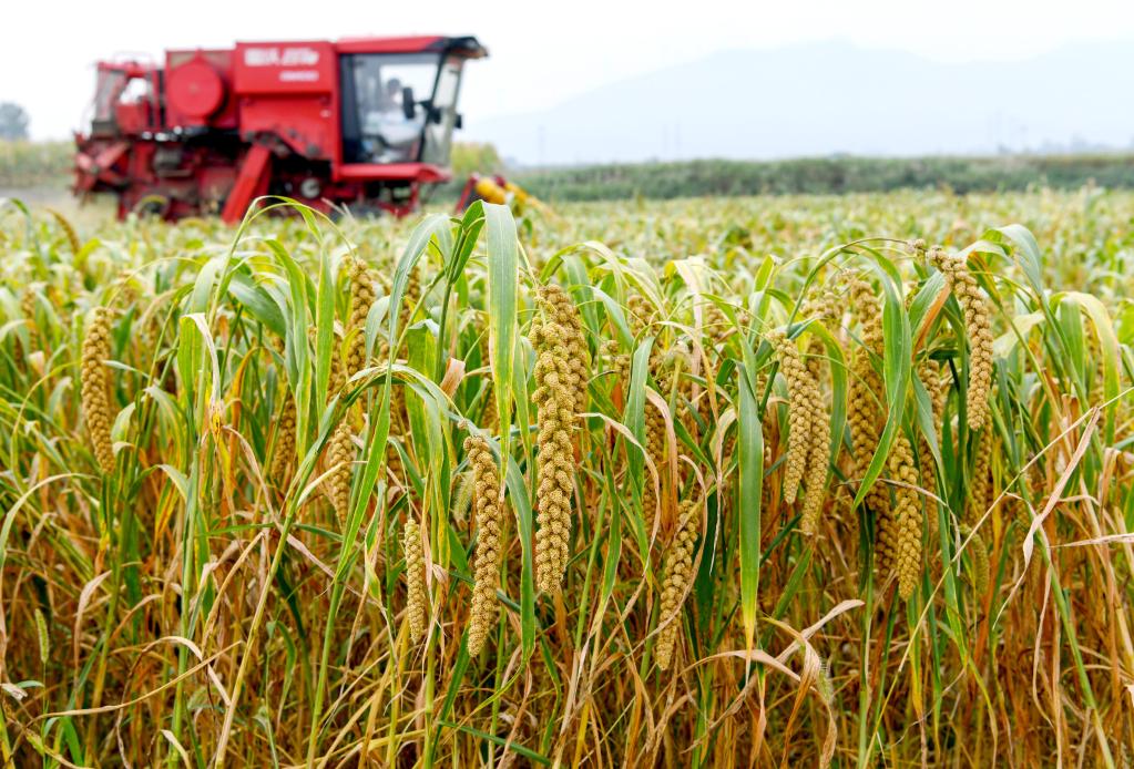9月21日,在河南省洛阳市伊滨区寇店镇二教塔社区,收割机在地里收割谷子。新华社发(张怡熙 摄)