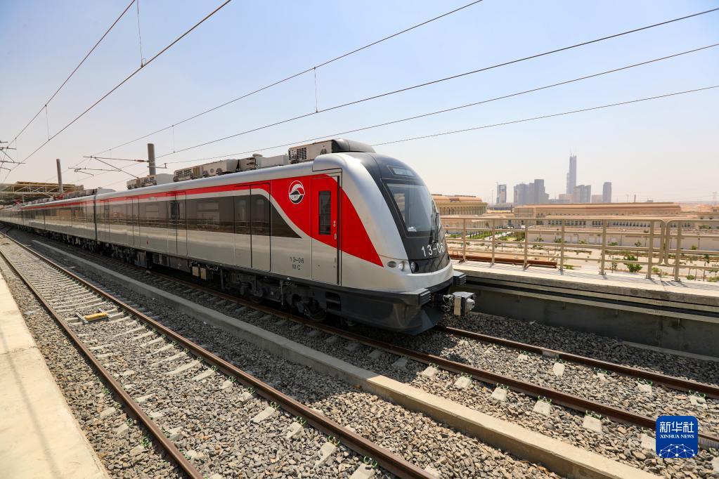 这是2022年7月3日在埃及开罗东部拍摄的一列试运行的轻轨列车。由中国企业承建的埃及斋月十日城轻轨铁路当日通车试运行,这是埃及第一条电气化铁路。 新华社记者 隋先凯 摄