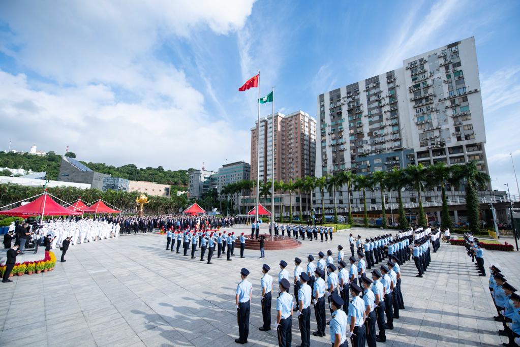 庄严隆重的升旗仪式上午8时在金莲花广场举行,由特区治安警察局特警队组成的护旗队伍护送中华人民共和国国旗和澳门特别行政区区旗进场。随着仪仗队奏响国歌,国旗、区旗冉冉升起,现场全体肃立,高唱国歌。