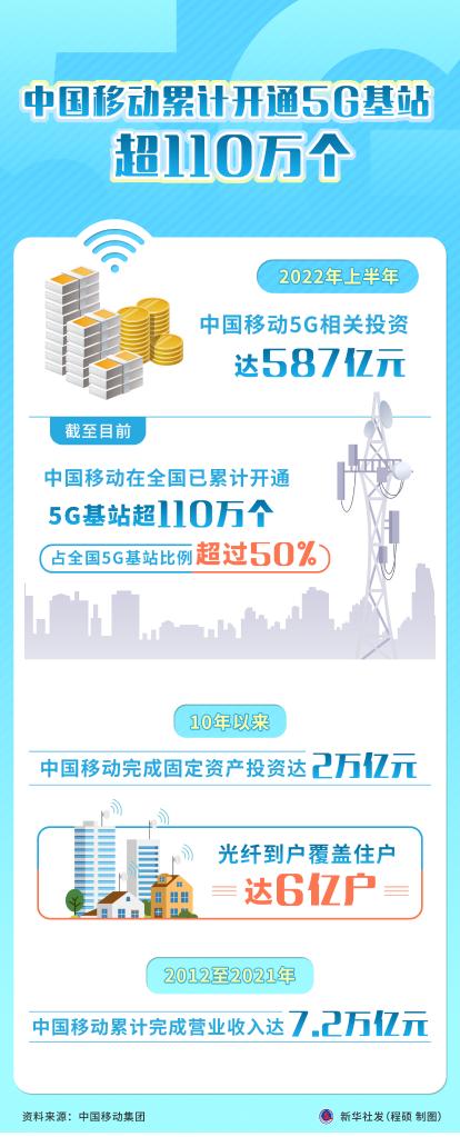 新华社北京10月2日电(记者高亢、戴小河)记者从中国移动集团获悉,2022年上半年中国移动5G相关投资达587亿元,截至目前,中国移动在全国已累计开通5G基站超110万个,占全国5G基站比例超过50%。
