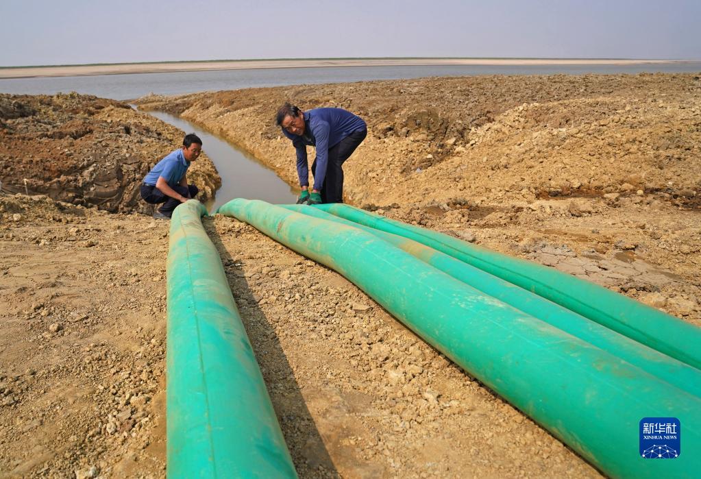 在江西省都昌县,都昌县候鸟自然保护区的工作人员用水泵将鄱阳湖主航道的水抽至人工水渠,然后输入至碟形湖中(9月28日摄)。