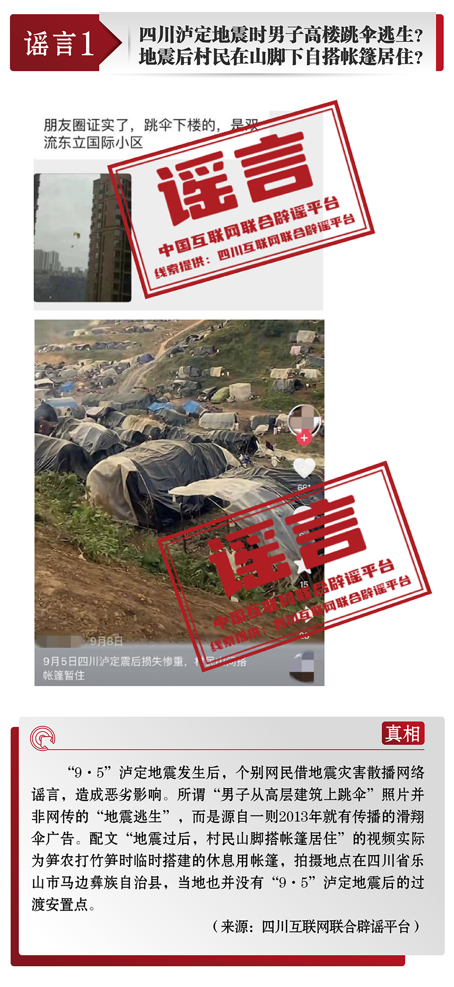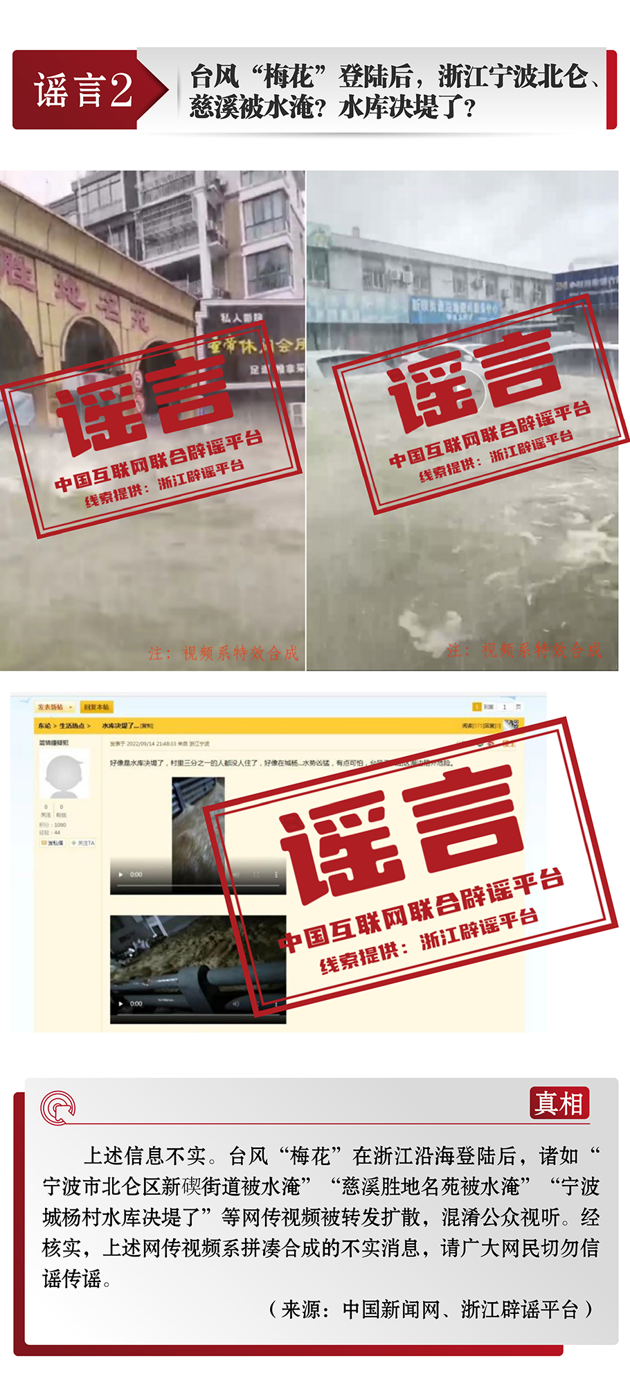 “拼图”自然灾害场景,传递恐慌情绪。个别网民和自媒体机构借地震、台风等自然灾害编造传播不实信息,造成恶劣影响。如“男子从高层建筑上跳伞逃生”“地震后村民在山脚下自搭帐篷居住”等谣言均属用“移花接木”手法编撰的虚假信息,而所谓“浙江宁波北仑、慈溪被水淹”“宁波城杨村水库决堤了”等网传视频也是用特效拼凑合成的内容。