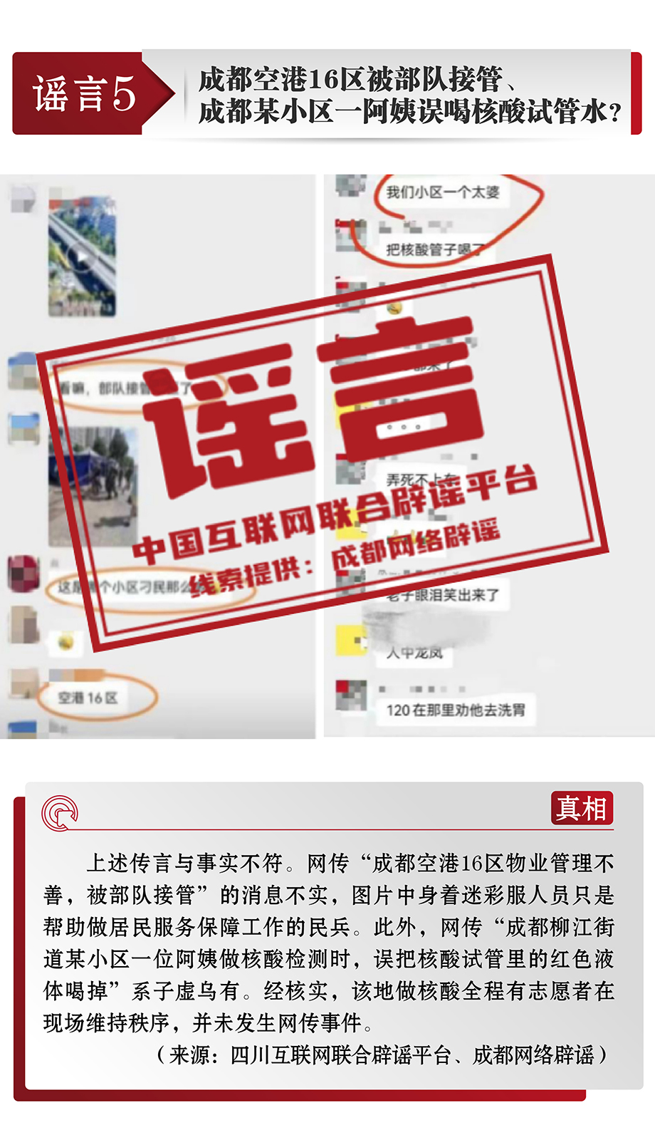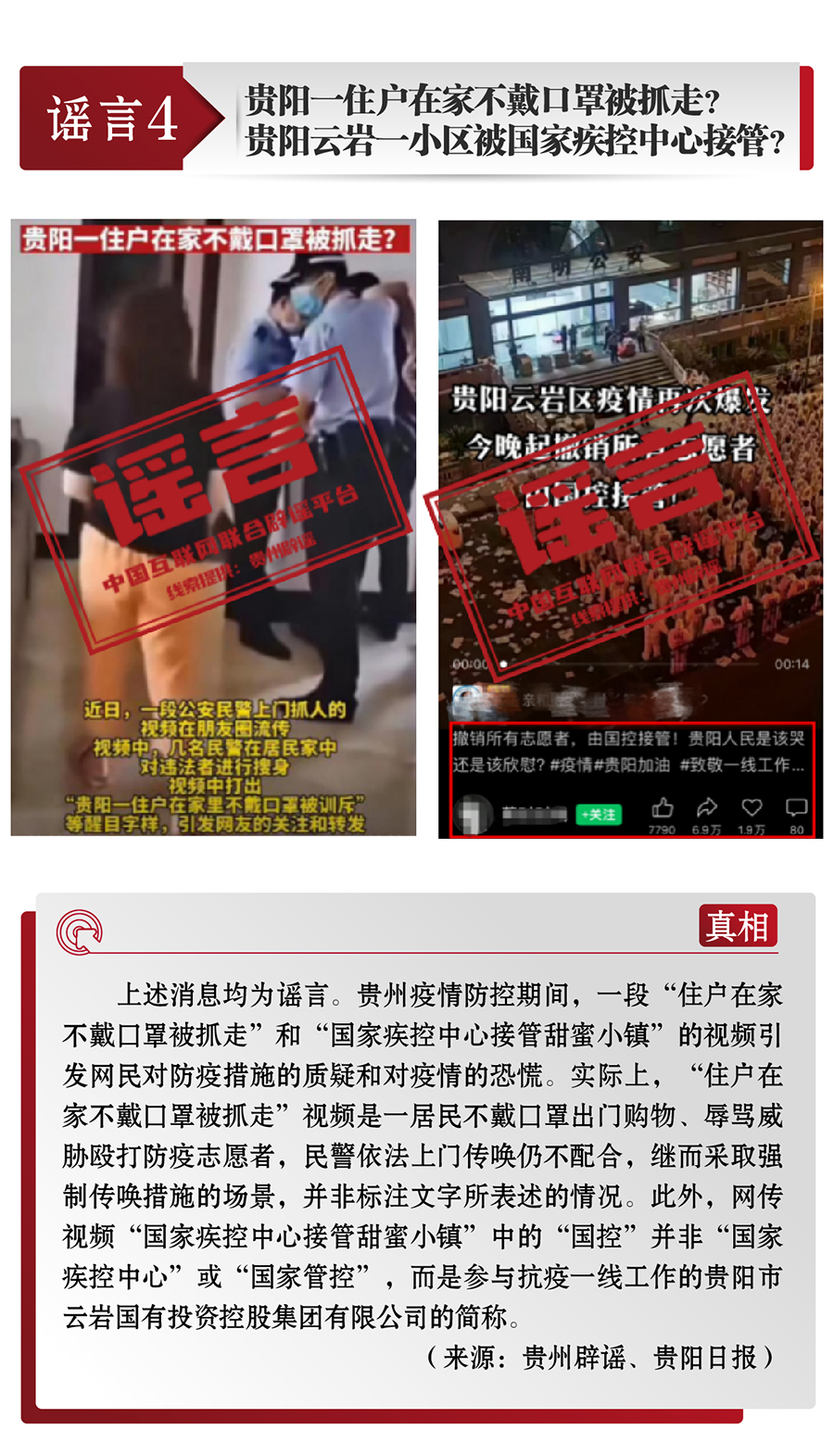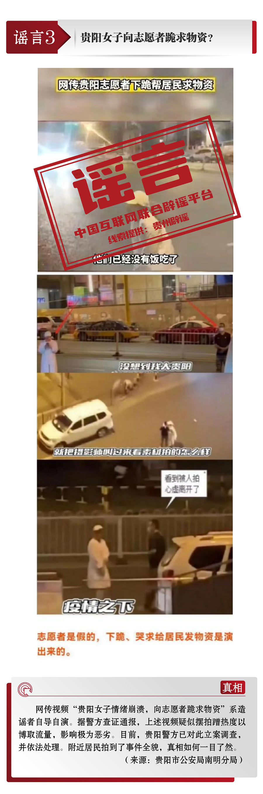 歪曲防控举措,扰乱防疫秩序。涉疫情谣言混淆公众视听,别有用心者为赚取网民关注,罔顾事实真相,借机炒作、造势,怂恿对立情绪。网传“贵阳云岩撤销所有志愿者,由国控接管”的消息系张冠李戴,将参与抗疫一线工作的贵阳市某国企的简称误传为“国家疾控中心”;“成都空港16区被部队接管”以虚假配文“添油加醋”;“贵阳一住户在家不戴口罩被抓走”则是扭曲事实、颠倒黑白。更令人气愤的是,所谓“贵阳女子情绪崩溃,向志愿者跪求物资”的网传视频实为一场自导自演的闹剧。所幸,附近居民从鸟瞰视角拍到了事件全貌,志愿者是假的,下跪、哭求给居民发物资是演的。