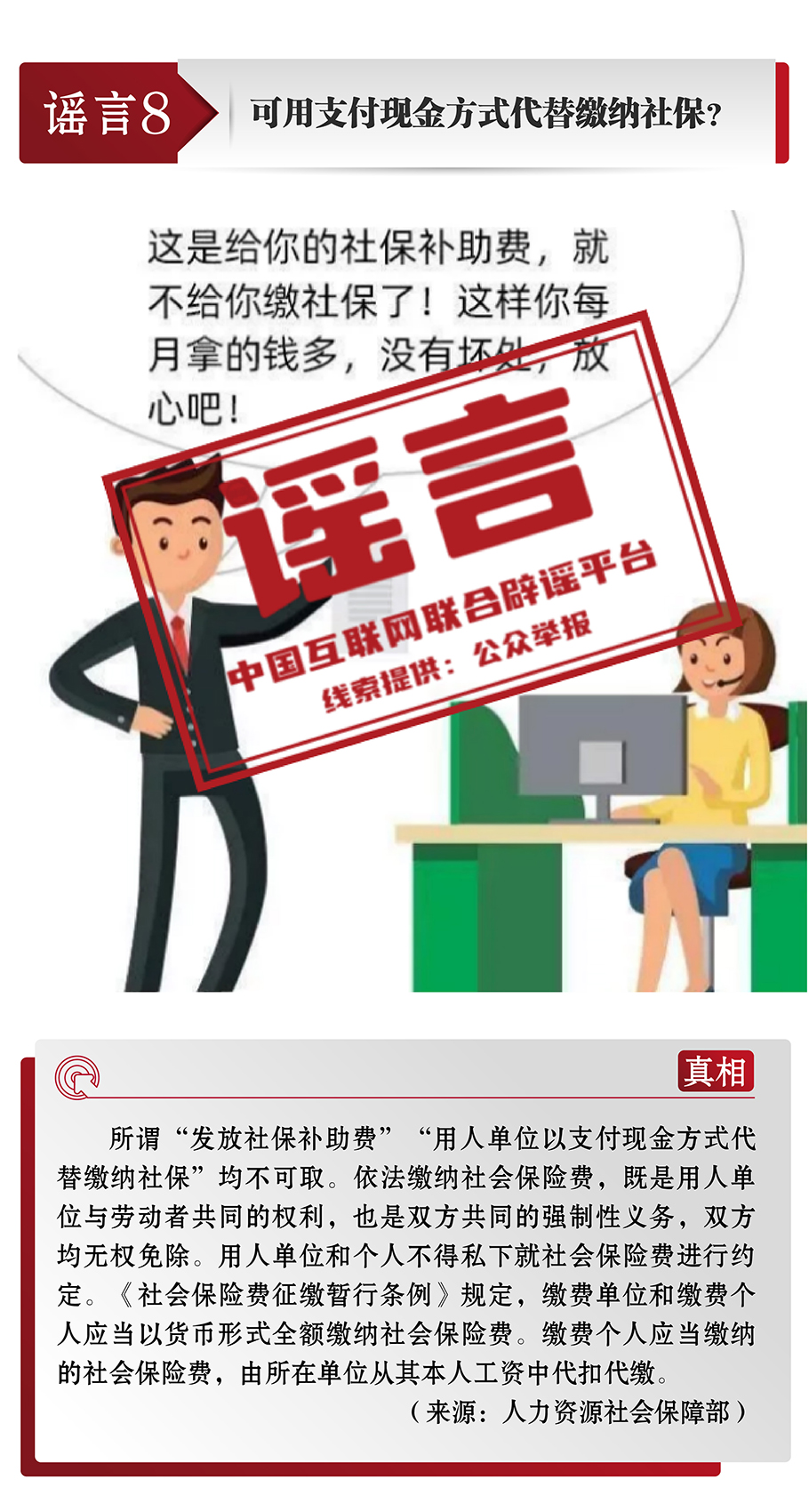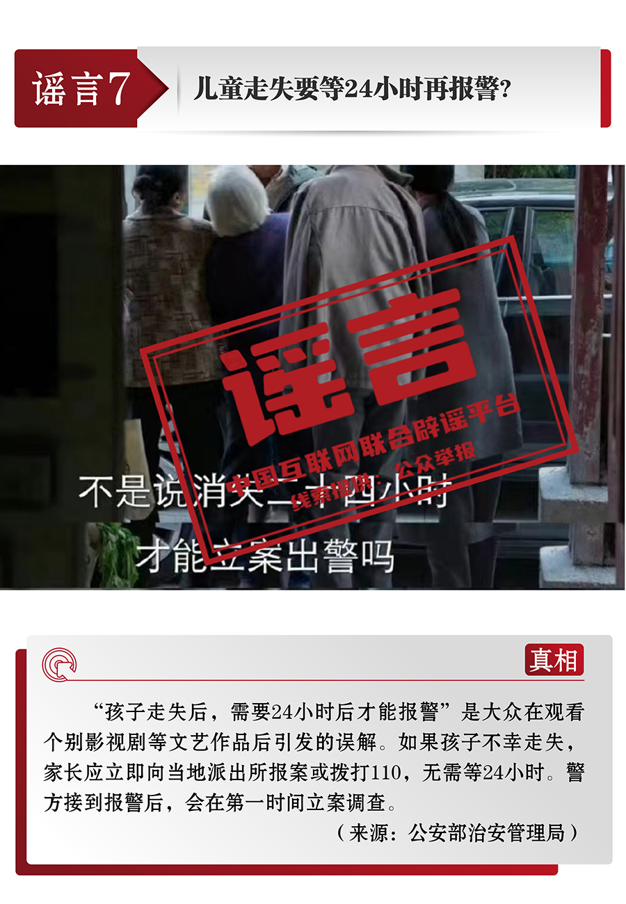 散布民生谣言,误导社会关切。“儿童走失要等24小时再报警”其实是大众在观看个别影视剧等文艺作品后产生的误解。如果孩子不幸走失,家长应立即向当地派出所报案或拨打110,无需等待24小时。有的用人单位“用支付现金方式代替缴纳社保”,还美其名曰为员工好,实际违反政策规定。