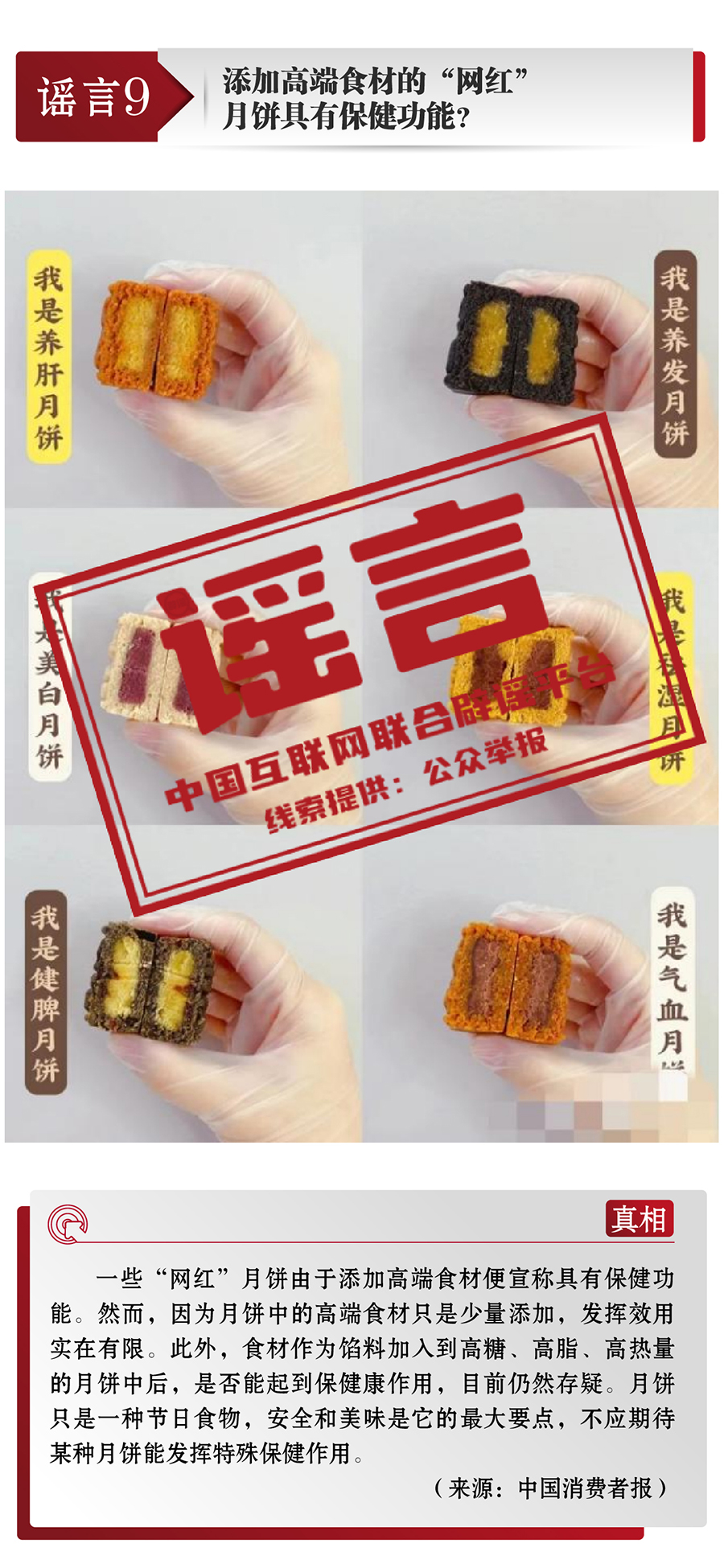 假借健康营销,干扰正常生活。中秋佳节,月饼成了热门,一些“网红”月饼以“添加高端食材,具有保健功能”为噱头开展营销。然而,月饼中的高端食材只是少量添加,发挥效用实在有限。此外,“因疫情自来水被加大氯气注入量,需静置两小时再使用”“经常吃含酵母的食物容易得胃病”等谣言扰乱民众正常生活。