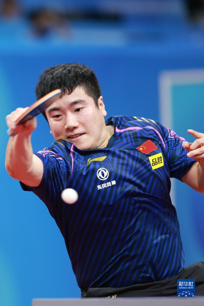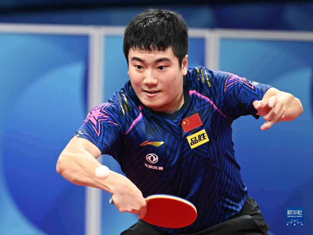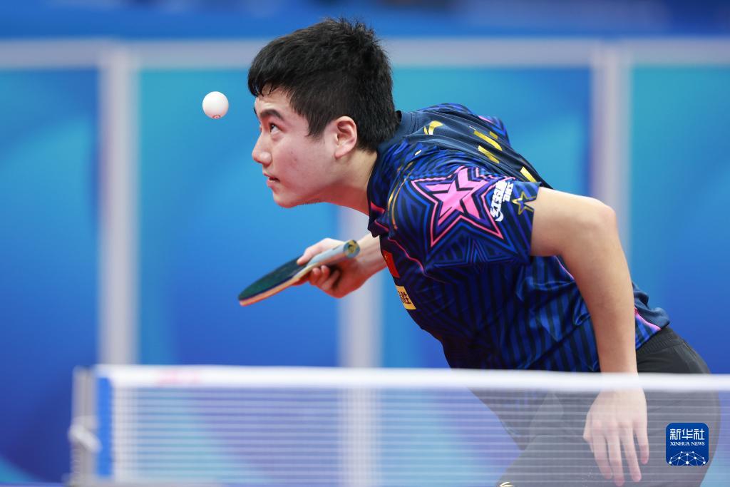 10月2日,中国队选手梁靖崑在比赛中回球,他以3比0战胜美国队选手梁吉善。新华社记者 胥冰洁 摄