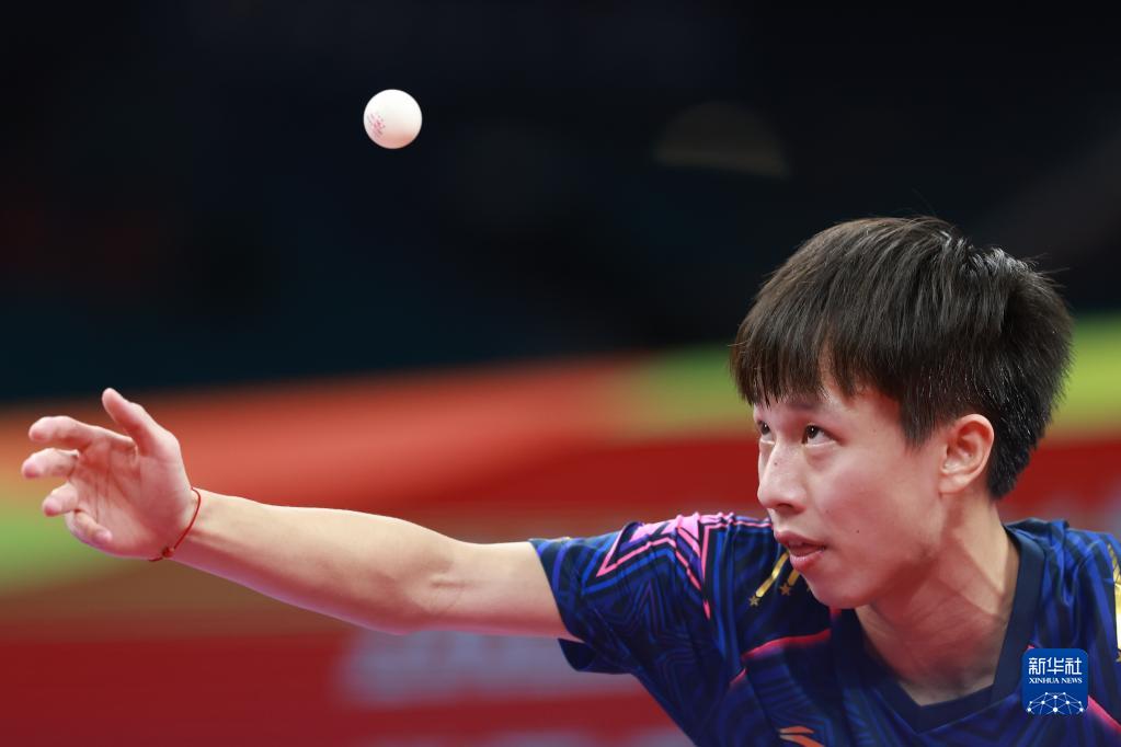 10月2日,中国队选手梁靖崑在比赛中发球,他以3比0战胜美国队选手梁吉善。新华社记者 刘续 摄