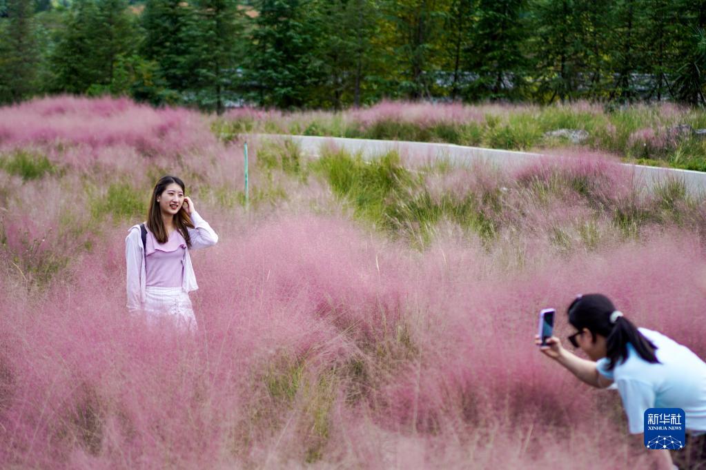 10月2日,游客在叠石花谷景区内粉黛乱子草组成的粉色花海中拍照留念。