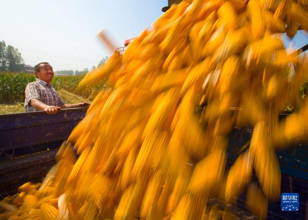 10月3日,在河南省夏邑县会亭镇,村民忙着收获玉米。