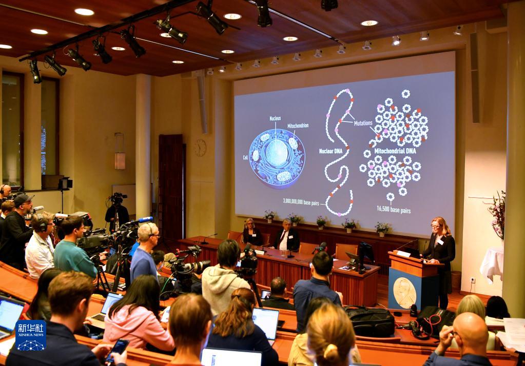 这是10月3日在瑞典斯德哥尔摩卡罗琳医学院拍摄的2022年诺贝尔生理学或医学奖公布现场。新华社记者 任鹏飞 摄