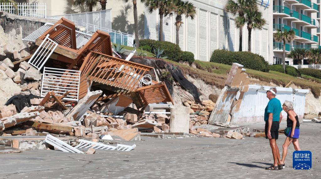 10月3日,在美国佛罗里达州代托纳比奇海滩,人们查看遭飓风“伊恩”损毁的设施。新华社/美联