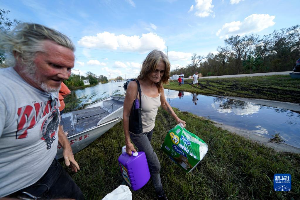 10月3日,在美国佛罗里达州阿卡迪亚,当地民众领取物资。新华社/美联