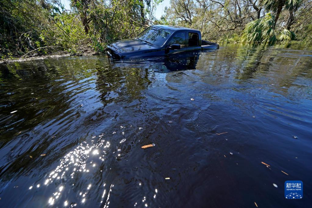 这是10月3日在美国佛罗里达州北港拍摄的淹在洪水中的车辆。新华社/美联
