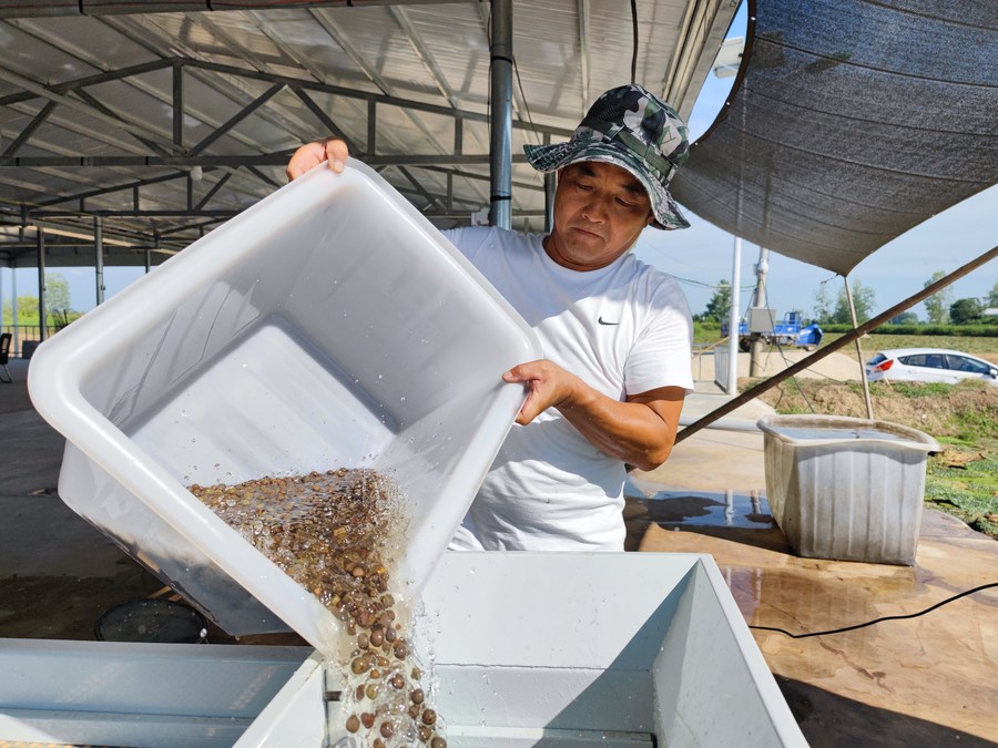 2022年8月11日,胡广富将新采摘的芡实果进行分拣。新华社记者 何曦悦 摄