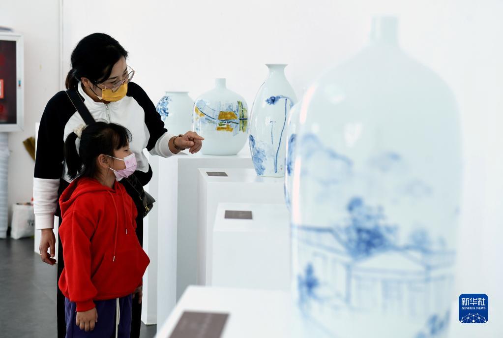 10月4日,游客在河北省石家庄市井陉县秀林镇南横口村陶瓷水镇展示中心参观瓷器。