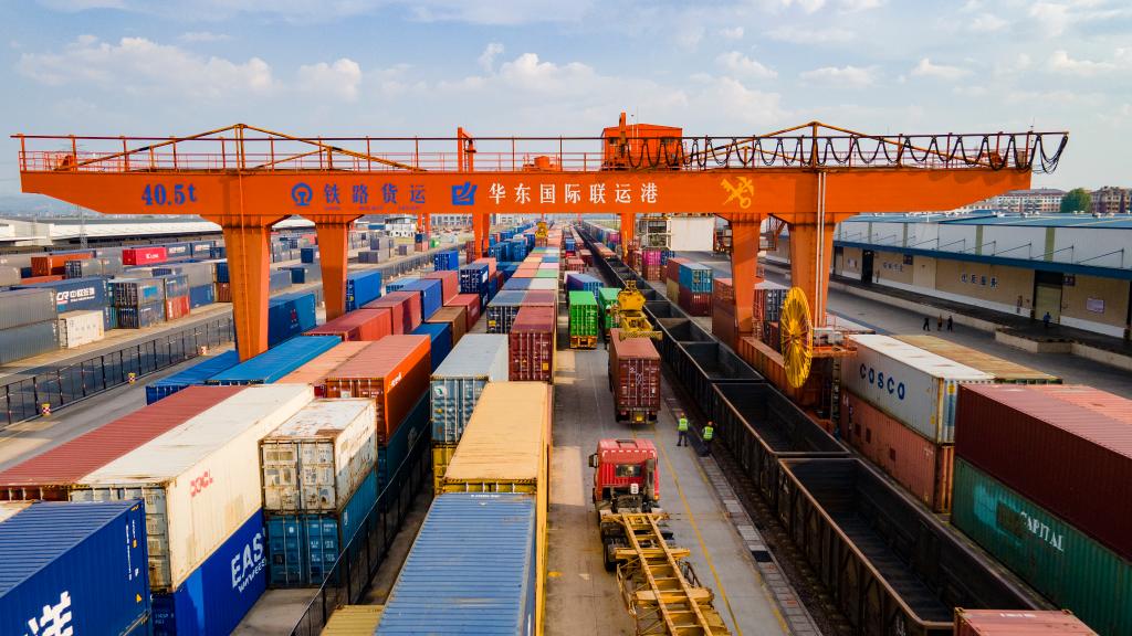 金华南站货场内繁忙的装车景象。(受访者供图)