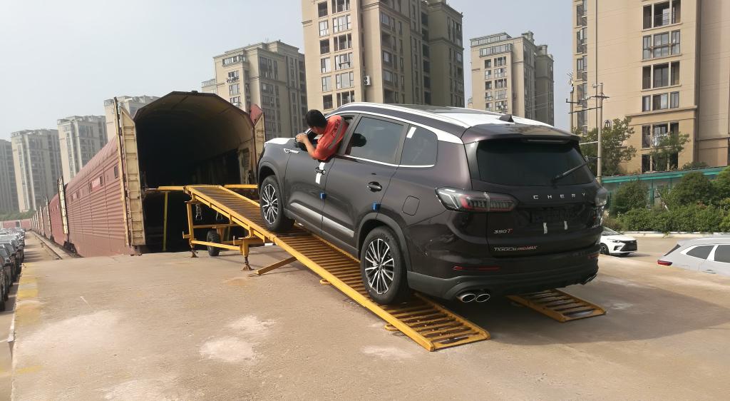 国庆节假期,安徽芜湖西货场,工作人员正将汽车开进火车车厢。新华社记者胡锐 摄