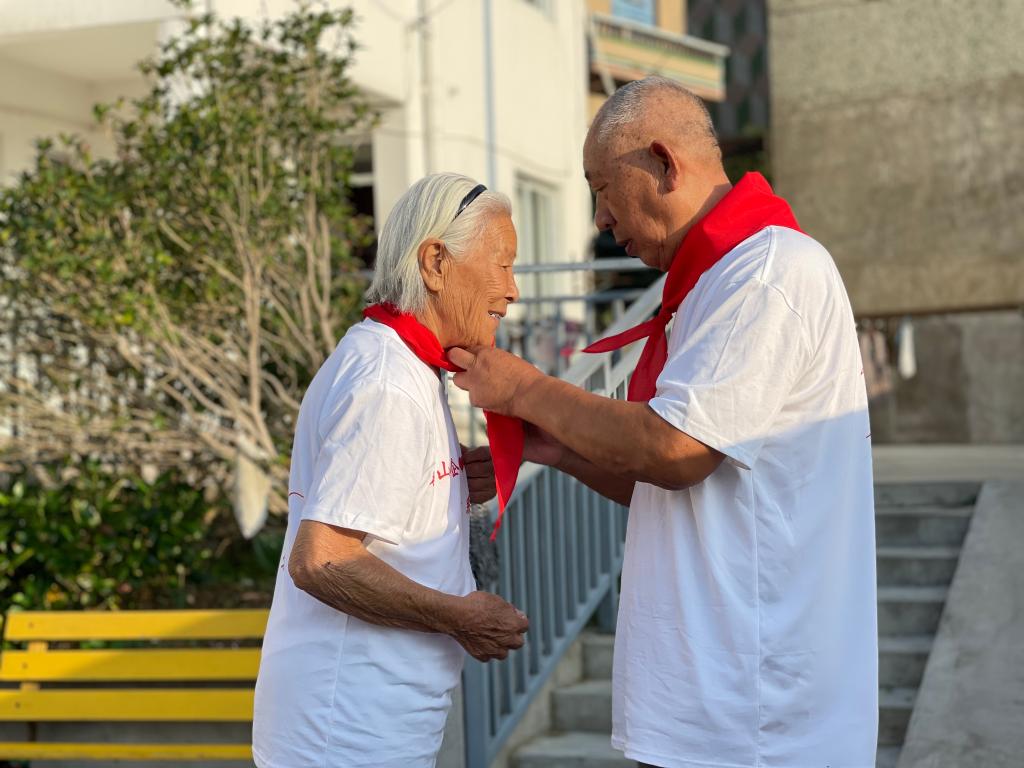 浙江省舟山市柴山岛白沙港村托老所的老人们互相帮助系红领巾。(受访者供图)