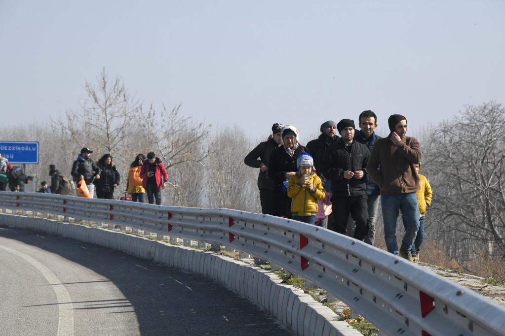 2020年3月1日,在土耳其埃迪尔内省,难民和非法移民步行前往土耳其与希腊边境。新华社记者徐速绘摄