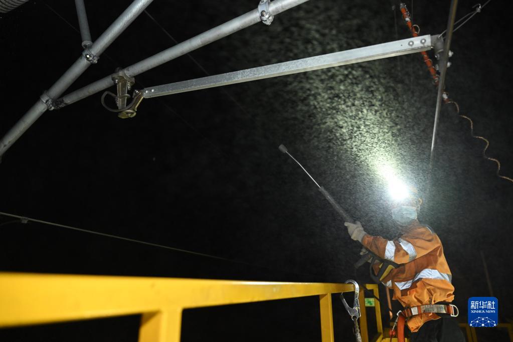 10月5日凌晨,在安徽宣城杭黄高铁绩溪段,接触网工在冲洗接触网绝缘子。