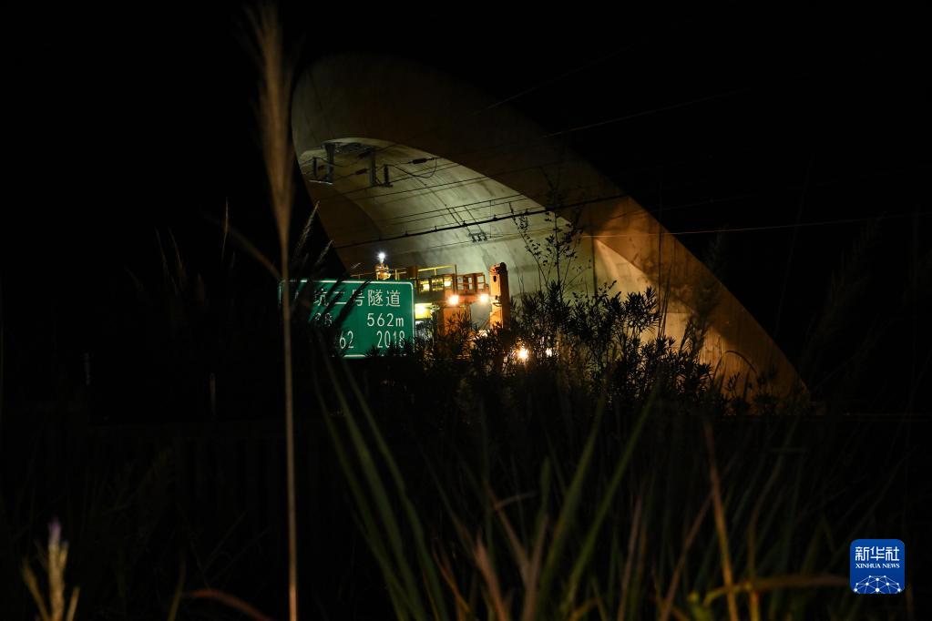 10月5日凌晨,在安徽宣城杭黄高铁绩溪段,接触网工在检修接触网设备。