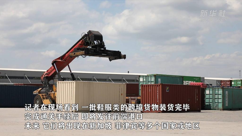记者在现场看到,一批鞋服类的跨境货物装货完毕,完成通关手续后,即将发往前端港口。未来,它们将出现在新加坡、菲律宾等多个国家或地区。
