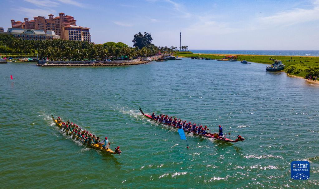 海南省琼海市博鳌镇在万泉河入海口举行龙舟赛活动(2022年6月3日摄,无人机照片)