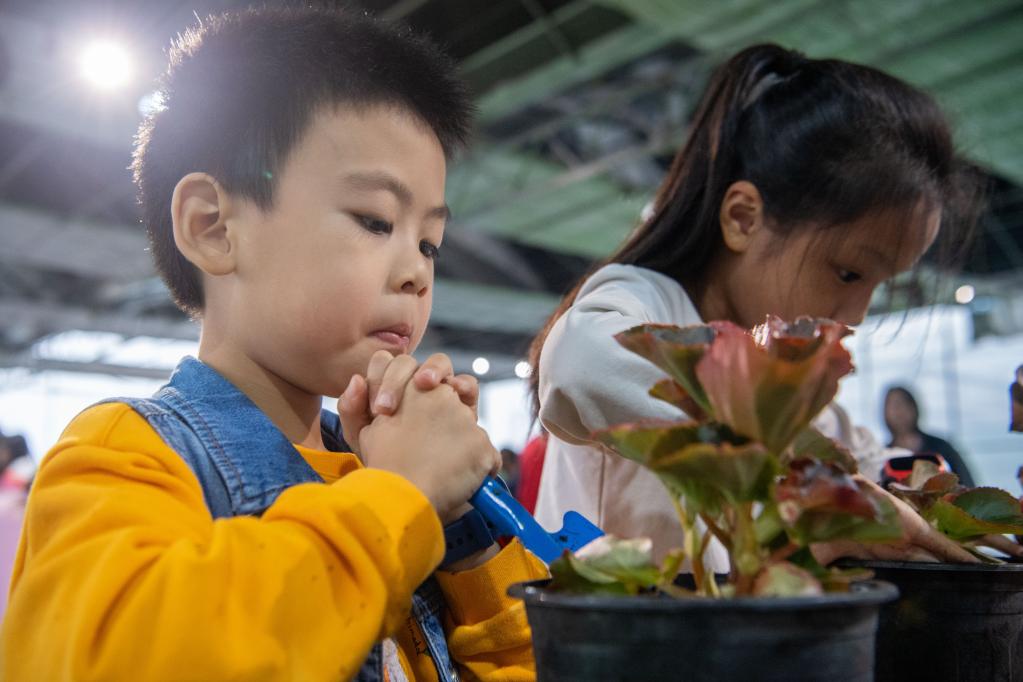 10月5日,在重庆市大足区雍溪镇慈云村的天华百卉园内,小朋友在学习种植技巧。新华社记者 唐奕 摄