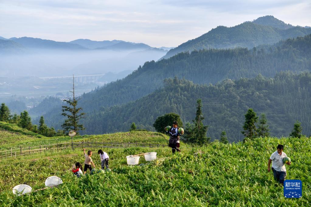 贵州省榕江县忠诚镇苗本村的农民在梯田上收获西瓜(2022年7月16日摄)。新华社记者 杨文斌 摄