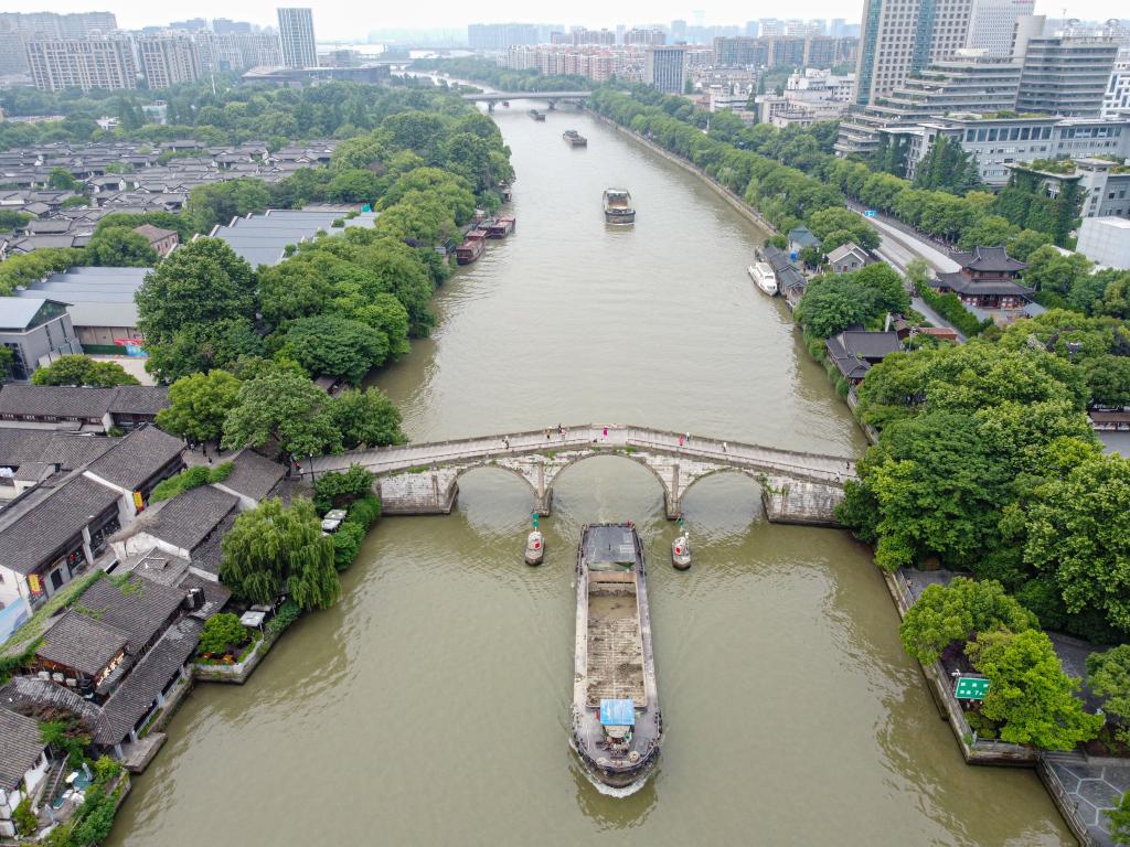 5月27日,一艘货船驶过京杭大运河南端标志建筑杭州拱宸桥。(无人机照片)新华社记者江汉 摄