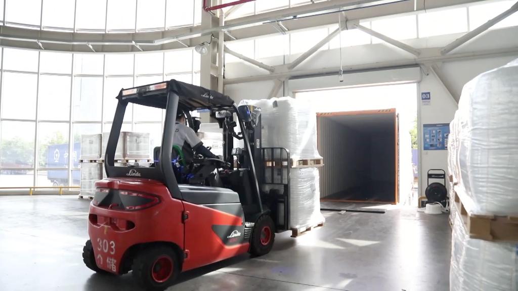 位于浙江省嘉兴市的中国巨石桐乡智能制造基地里,一批生产好的玻璃纤维产品将运往码头,通过京杭大运河内河航运发往港口。