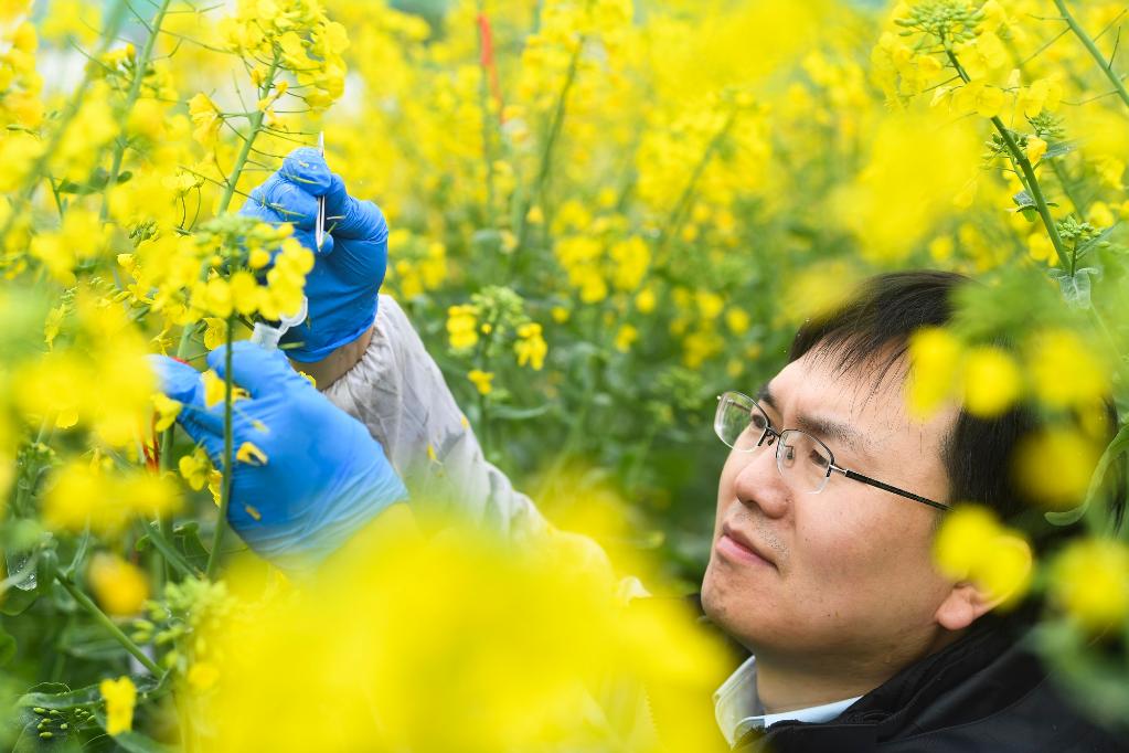 图为卢坤在油菜试验田里进行取样作业。新华社记者王全超 摄