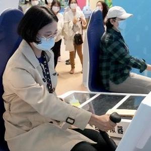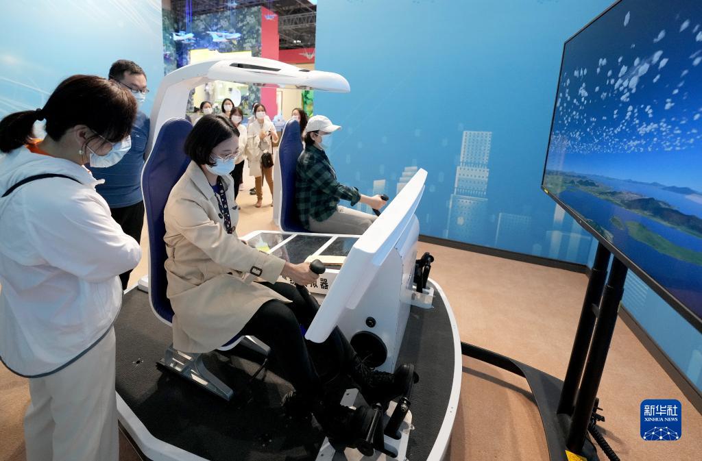 10月7日,观众在“奋进新时代”主题成就展上体验操纵直升机训练模拟器。当日是国庆长假的最后一天,大批观众来到北京展览馆参观“奋进新时代”主题成就展。新华社记者 王毓国 摄