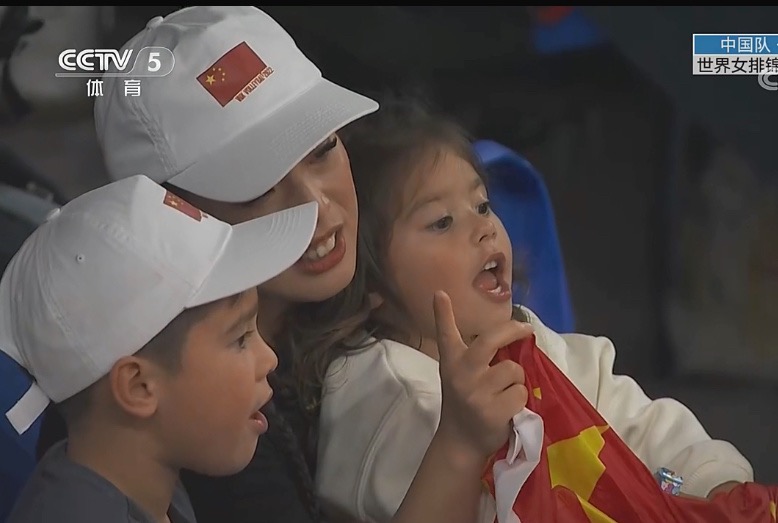 沈小玫与孩子们为中国女排加油。电视转播画面截图