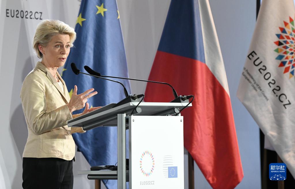 10月7日,在捷克首都布拉格,欧盟委员会主席冯德莱恩出席欧盟领导人非正式会议的会后联合新闻发布会。新华社记者 连漪 摄