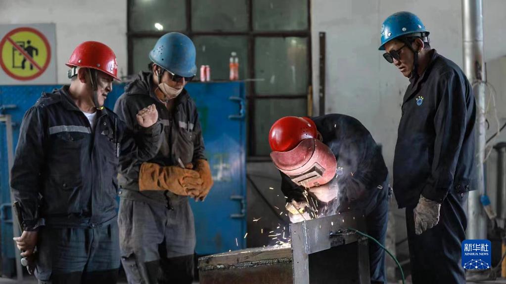 旦增顿珠(右二)和工友在维修设备(2022年7月13日摄)。新华社发