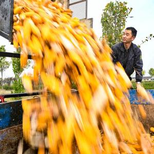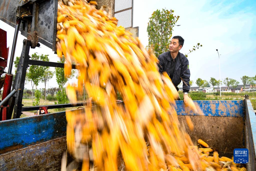 10月8日,河南省济源市梨林镇农民在田间收获玉米。当日是寒露节气,各地农民抢抓农时忙碌在田间地头。新华社发(苗秋闹 摄)