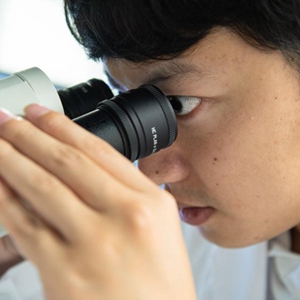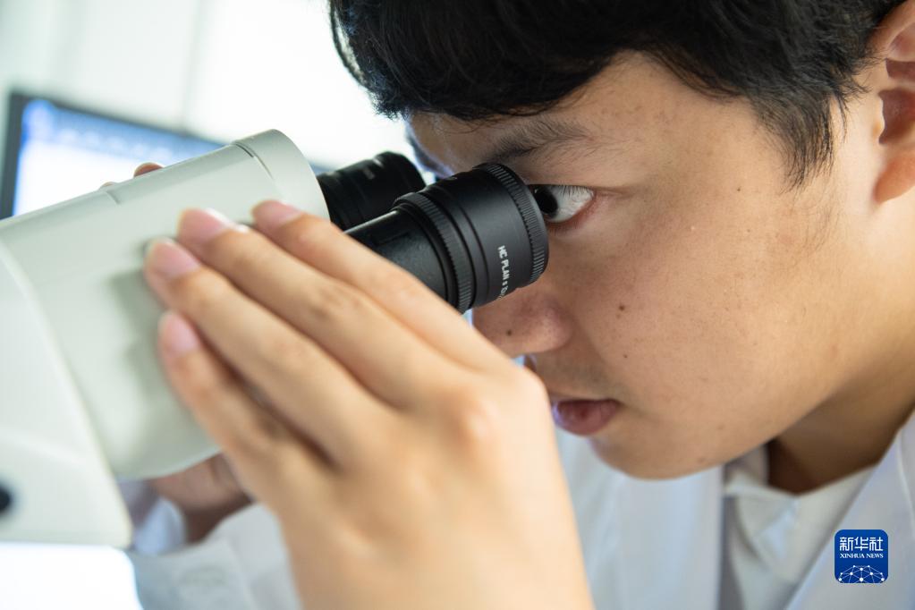 10月6日,“95后”的澳门科技大学月球与行星科学国家重点实验室博士生刘子博使用光学显微镜观察月球陨石薄片的显微特征。新华社记者 张金加 摄