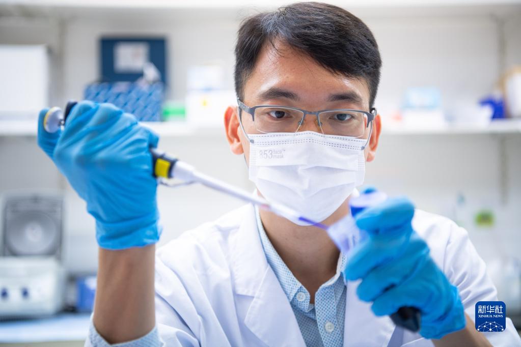 10月7日,澳门大学健康科学学院副教授周昶行在实验室进行液体取样。新华社记者 张金加 摄