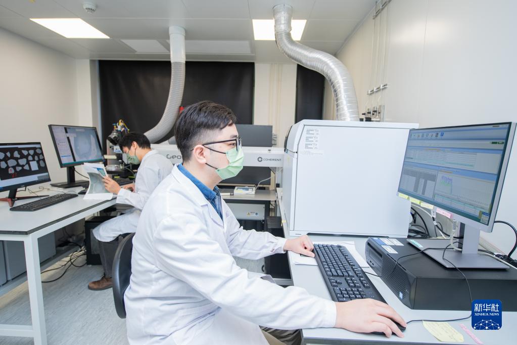 10月6日,澳门科技大学月球与行星科学国家重点实验室博士生梁柏健在实验室工作。新华社记者 张金加 摄