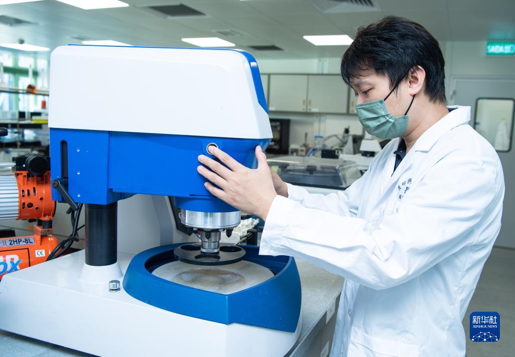10月6日,澳门科技大学月球与行星科学国家重点实验室助理教授邓志培在实验室使用机械抛光机。新华社记者 张金加 摄