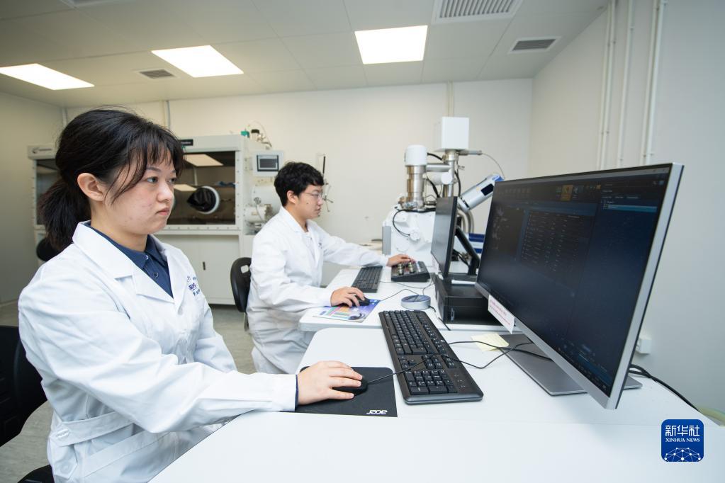 10月6日,“95后”的澳门科技大学月球与行星科学国家重点实验室博士生罗希子(前)、刘子博在实验室工作。新华社记者 张金加 摄