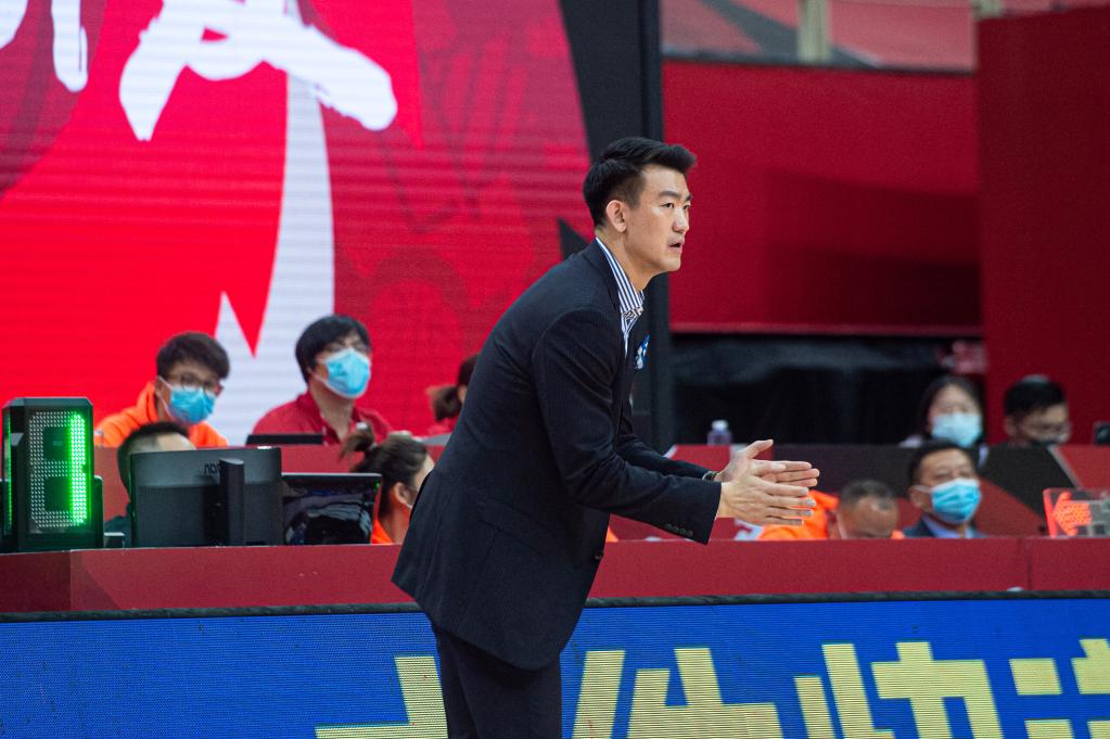 浙江广厦队主教练王博在比赛中指挥