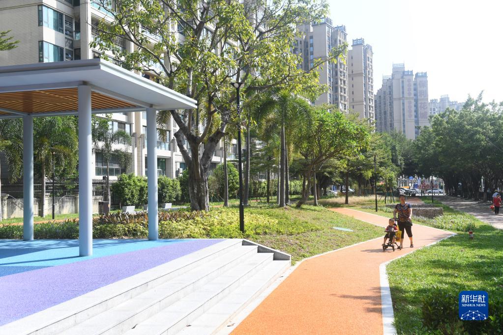 10月10日,市民在位于广州市花都区的紫兰口袋公园里散步。